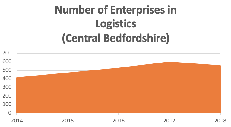 The number of logistics sector businesses based in the Central Bedfordshire increased by 140 from 2014 to 2018 135 of the new businesses had fewer than 10 employees.
